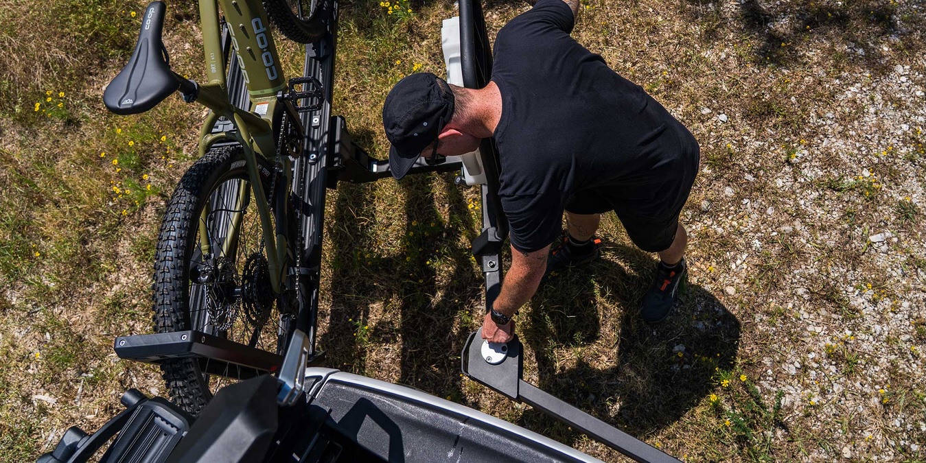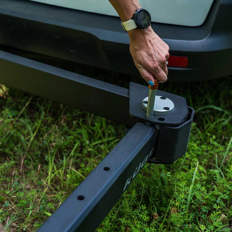 付属のロック式ヒッチピンとフラットロック™ ヒッチカムシステムが連動し、サイクルラックをガタつき無く確実に固定します。